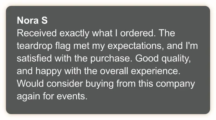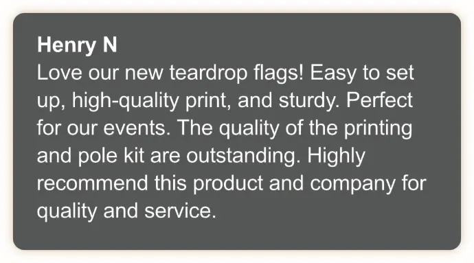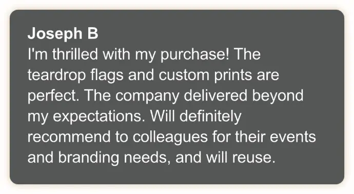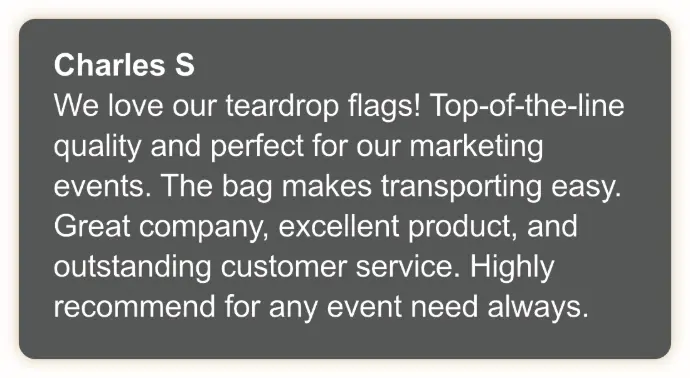 Our branded teardrop flags are designed to elevate your outdoor events and reinforce your brand identity, and while results may vary, our customers have reported increased brand awareness and customer engagement after using our product.