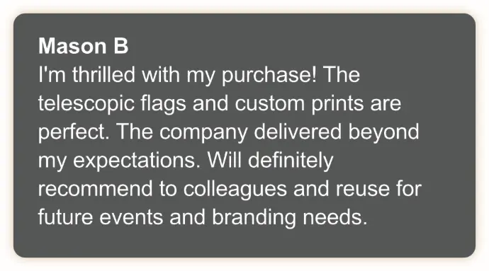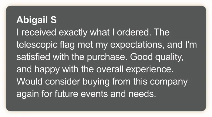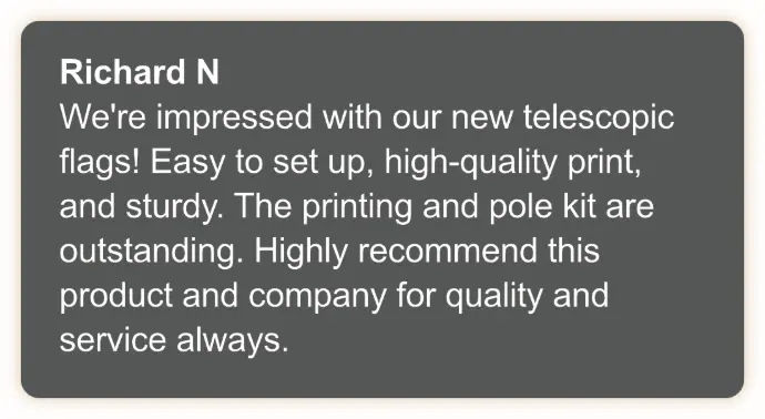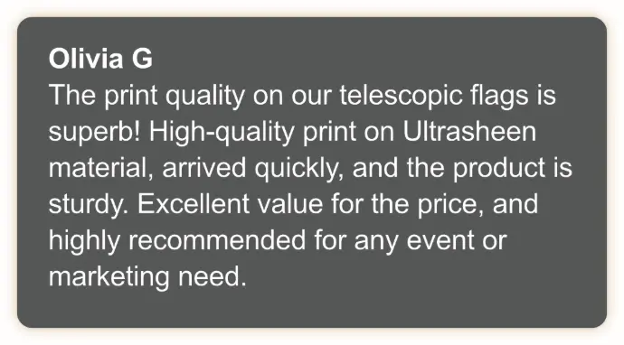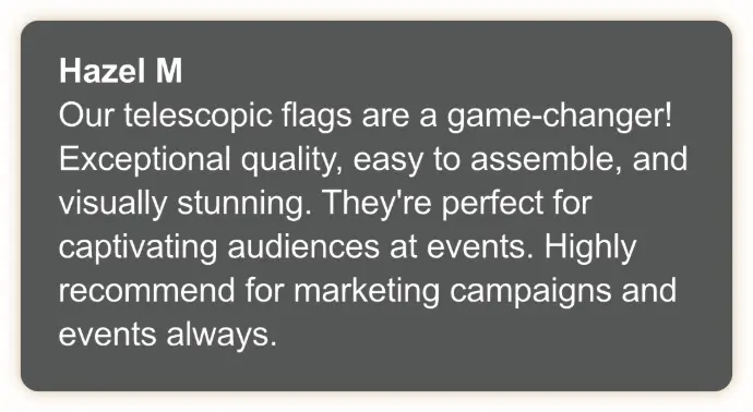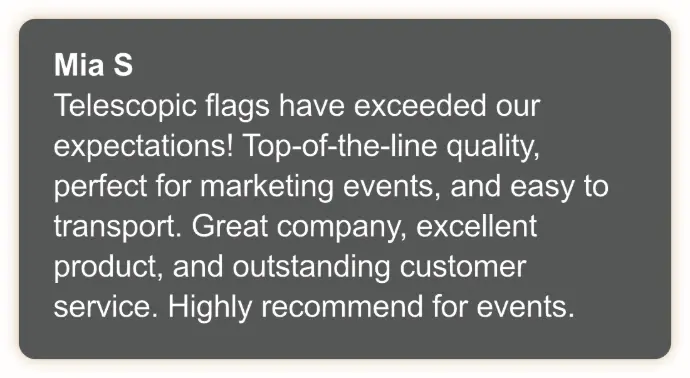 Our branded telescopic flags are designed to elevate your outdoor events and reinforce your brand identity, and while results may vary, our customers have reported increased brand awareness and customer engagement after using our product.