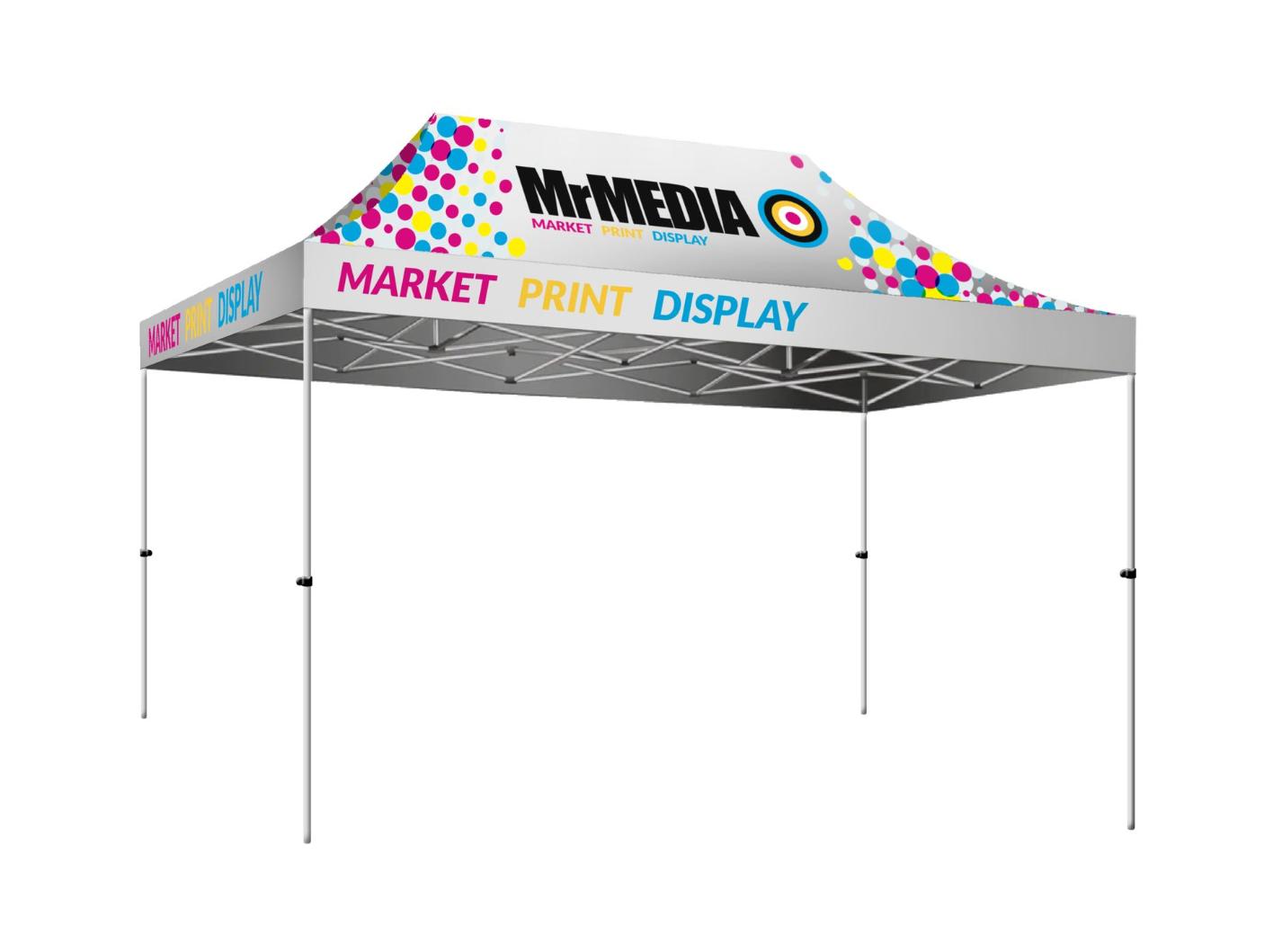 SKU - GZ43USCALU - Description: Tent 15 x 10', UV Print, Aluminum, Digitally printed with Flexible UV Ink onto 260gsm 100% Waterproof UV Coated Fabric (5-year Non Fade guarantee on the print), Supplied complete with a Deluxe Hexagon Aluminum Frame, Carry bag and Toolkit.