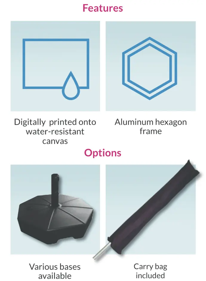 Withstand the Elements with Confidence - Our umbrellas are built to last, with a sturdy Aluminum Hexagon frame that can withstand weather conditions. You can trust that your umbrella will remain standing and provide shade for your audience.