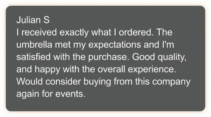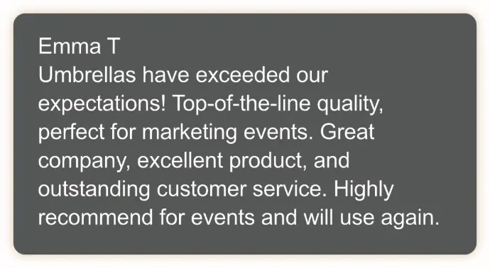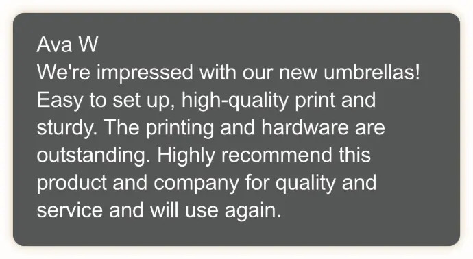 Our branded umbrellas are designed to elevate your outdoor events and reinforce your brand identity, and while results may vary, our customers have reported increased brand awareness and customer engagement after using our product.