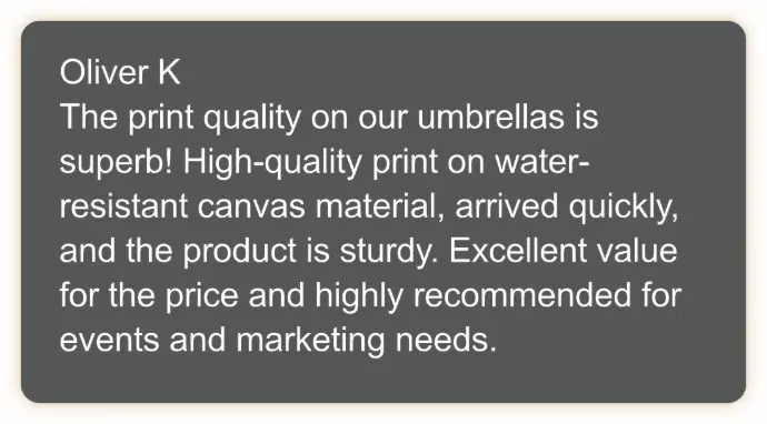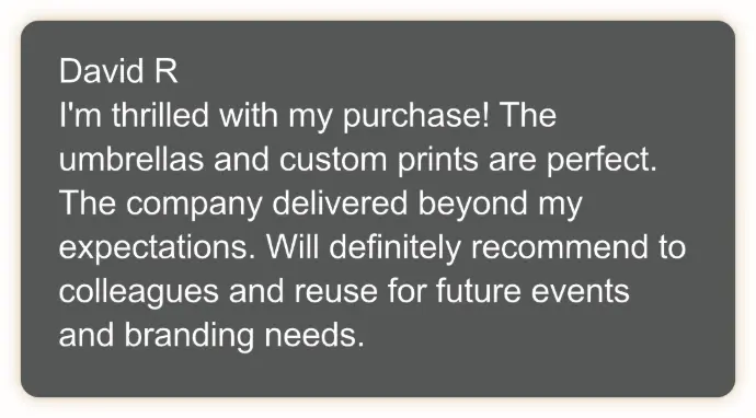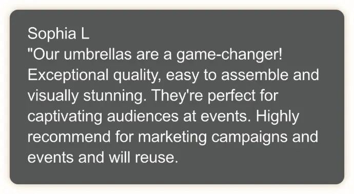 Our branded umbrellas combine exceptional quality, ease of use, and stunning visual impact, delivering unparalleled brand visibility and customer support that sets it apart from competitors.